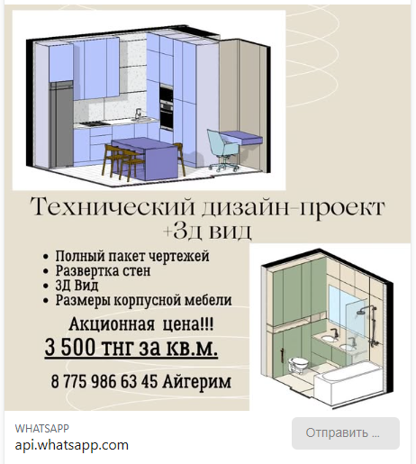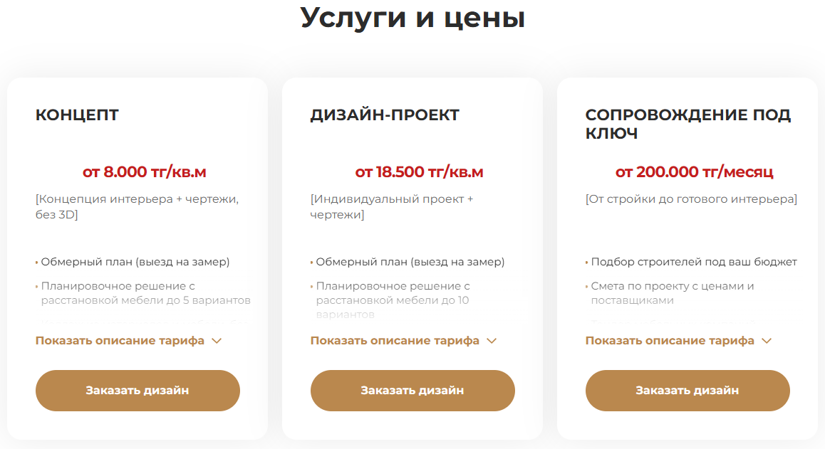 Мы привыкли продавать сразу весь дизайн-проект целиком: "Вот полный пакет услуг — планировка, 3D-визуализация, чертежи, комплектация, авторский надзор. Цена 1 миллион тенге. Хотите — покупайте."