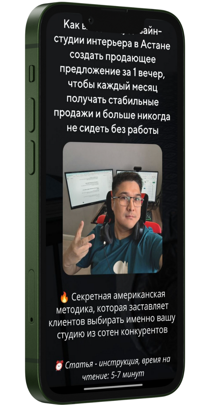 Увидите точную структуру системы продаж для дизайн-студий ✨. Узнаете, что давать бесплатно на первом шаге (например, "7 ошибок при выборе пола в Астане").